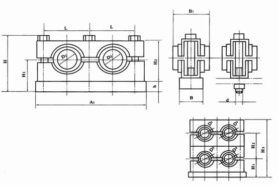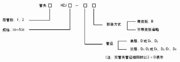 2、標(biāo)記示例: (1)單管夾,單層,管徑D=18,帶底板 管夾1HZJ50-18B (2)單管夾,雙層,上層管徑D1=18,下層管徑D2=22,帶底板 管夾1HZJ50-18/22B (3)雙管夾,單層,管徑不同,D1=18,D2=22,帶底板 管夾2HZJ50-18、22B (4)雙管夾,單層,管徑相同,D1=D2=18,帶底板 管夾2HZJ50-2×18B (5)雙管夾,單層,管徑相同,D1=D2=18,不帶底板 管夾2HZJ50-2×18 (6)雙管夾,雙層,管徑不同,上層管徑D1=16,D2=18,下層管徑D2=20,D4=22,帶底板 管夾2HZJ-16、18/20、22B (7)雙管夾,雙層,每層管徑相同,上層管徑D1=D2=18,下層管徑D3=D4=22,帶底板 管夾2HZJ-2×18/2×22B (8)單、雙管夾,雙層,上層為單管夾,管徑D1=18,下層為雙管夾,管徑D2=D3=22,帶底板 管夾1/2HZJ50-18/2×22B (9)雙管夾,雙層,管徑D1=16,D2=18, D3=D4=22,帶底板 管夾2HZJ50-16、18/2×22B |