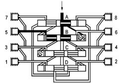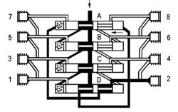 當(dāng)活塞D打通通向活塞A左側(cè)終端的連接通道后,潤滑劑流動并將活塞A向右推動。位于活塞A前右側(cè)的潤滑劑輸送到排出口1。 這時活塞B至D從左側(cè)向右側(cè)運動,按以上相反方向順序動作完成一個周期循環(huán)并可重新開始一個新的循環(huán)。