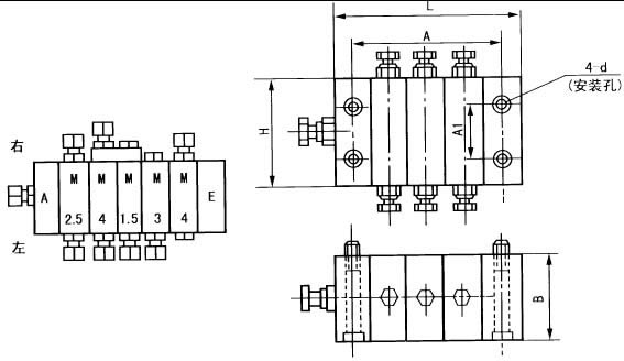 | 說(shuō)明:遞進(jìn)分配器的組合按進(jìn)油口元件首塊A、工作塊M和尾塊E、從左到右排列,在隊(duì)列下方出口稱為左,在隊(duì)列上方出口稱為右。如圖 | |||||||||||||||||||||||||||||||||||