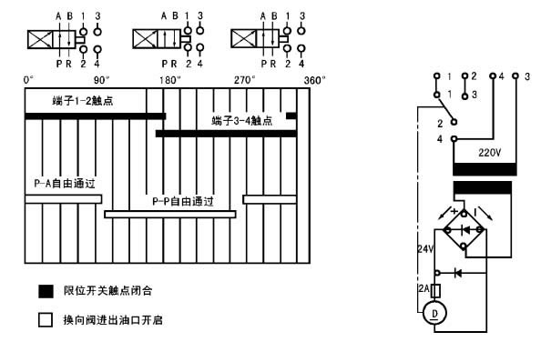 | 五、使用說明 1、該閥應(yīng)安裝在系統(tǒng)被控主、支管路的前端,且位于通風(fēng)、 干燥便于檢查及周圍無運動機(jī)構(gòu)干涉的部位。 2、當(dāng)作二位二通使用時,須把出油口“B”和回油口“R”封堵。 3、當(dāng)作二位三通使用時,須把出油口“B”封堵。 4、電控接線按上圖原理連接。 六、常見故障及排除方法 1、換向閥不換向。 可能無換向信號輸入電機(jī),線腳焊接脫落;電機(jī)軸與偏心輪松動未緊固;閥腔內(nèi)進(jìn)入雜質(zhì)滑芯卡死等原因,查明后排除即可。 2、滑芯二端漏油。 主要是二端密封圈損壞引起,可能是密封圈庫存久或長時間使用已老化,更換密封圈即可。 | |||||||||||||||