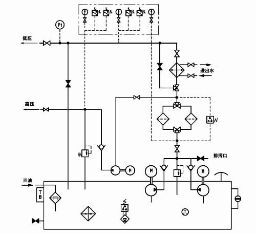 | 本產(chǎn)品主要由油箱(其內(nèi)裝有磁網(wǎng)過(guò)濾器)、低壓油泵裝置、高壓油泵裝置、雙筒網(wǎng)片式過(guò)濾器、手動(dòng)高壓油泵、冷卻器、管道、閥門(mén)、儀表盤(pán)及電控柜等組成。 在主機(jī)啟動(dòng)前,先啟動(dòng)低壓泵,當(dāng)?shù)蛪汗┯蛪毫φ:?,啟?dòng)吸口聯(lián)于低壓管道上的高壓油泵,高壓油經(jīng)高壓?jiǎn)蜗蜷y送往靜壓軸承,當(dāng)高壓達(dá)一定值使主軸浮起時(shí),主機(jī)就可啟動(dòng)、低速運(yùn)行或停止;主機(jī)轉(zhuǎn)速正常后,就可以停止高壓泵(低速運(yùn)行除外),但低壓油泵必須正常供油;低壓油泵從油箱吸油后經(jīng)單向閥,雙筒網(wǎng)式過(guò)濾器、冷卻器后亦往靜壓軸承,維持主機(jī)正常供油;若主機(jī)停止后,尚要定時(shí)由高壓泵和低壓泵供油,則由時(shí)間繼電器進(jìn)行控制向潤(rùn)滑點(diǎn)斷續(xù)供油。 高、低壓力的具體數(shù)值分別由系統(tǒng)中的低壓安全閥和高壓溢流閥控制。 主機(jī)正常運(yùn)行時(shí),低壓泵一臺(tái)工作,一臺(tái)備用,若系統(tǒng)壓力下降到某值時(shí),備用泵啟動(dòng)投入運(yùn)行,達(dá)到正常壓力時(shí)備用泵停止。若備用泵啟動(dòng)后壓力仍下降到某一更低值時(shí),就應(yīng)發(fā)出報(bào)警訊號(hào),考慮主機(jī)停車。 高壓柱塞泵有故障時(shí),可由備用手動(dòng)油泵供油。 過(guò)濾器置于冷卻器前,使粘度較小的油先通過(guò)過(guò)濾器,以提高過(guò)濾效果,過(guò)濾器一筒工作,一筒備用,由手動(dòng)切換閥控制。 油箱油位過(guò)低過(guò)高時(shí)均由油位訊號(hào)器發(fā)訊,人工加油或停止加油。 回油油箱內(nèi)設(shè)有磁網(wǎng)過(guò)濾器,能同時(shí)對(duì)油進(jìn)行過(guò)濾和吸附油中鐵質(zhì)微粒。 稀油站成套供貨時(shí)配有儀表和電控箱,以顯示運(yùn)行參數(shù)和實(shí)現(xiàn)稀油站自控、手控或報(bào)警。 油箱上裝有電接點(diǎn)雙金屬溫度計(jì),油溫低時(shí)發(fā)出信號(hào),人工接通電加熱器,達(dá)到設(shè)定溫度時(shí),自動(dòng)切斷電加熱器。 供油口裝有電接點(diǎn)壓力式溫度計(jì),根據(jù)供油溫度,調(diào)最高最低二個(gè)界限,用以控制冷卻器的使用與否。 | |||||||||||||||||||||||||||||||||||||||||||||||||||||||||||||||||||||||||||||||||||||||||||||||||||||||||||||||||||||||||||||||||||||||||||||||||||||||||||||||||||||||||||||||