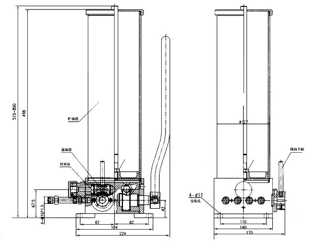 | 四、安裝及調(diào)試 安裝: 1、SRB-J7-4/4型手動(dòng)潤(rùn)滑泵應(yīng)安裝在以通風(fēng)、透光的室內(nèi),露天安裝使用必須加設(shè)防護(hù)罩,同時(shí)必須保證手柄能自由擺動(dòng)。油位指示桿上方應(yīng)有足夠的空間,以便油位指示桿能伸出,還能方便地向貯油器中加油潤(rùn)滑脂。 2、SRB-J7-4/4型手動(dòng)潤(rùn)滑泵必須直立安裝,并用四只M10×30螺栓緊固。 3、泵與主油管及系統(tǒng)中配管的連接處應(yīng)緊密,不得有滲漏現(xiàn)象,不允許使用麻絲或鉛油等輔助材料。 調(diào)試: 1、加潤(rùn)滑脂必須從加油過(guò)濾器裝置中用專用的加油 泵注入,嚴(yán)禁揭蓋加油,防止油中油臟物或空氣混合,致使泵不能正常工作。加入潤(rùn)滑脂的針入度為不低于265(25℃,150g)1/10mm。 2、起動(dòng)前,應(yīng)向壓力表接頭內(nèi)注50#機(jī)械油,以便干油進(jìn)入壓力表而影響顯示精度。 3、當(dāng)手柄來(lái)回扳動(dòng),這時(shí)潤(rùn)滑脂將被入主油管中,系統(tǒng)中的給油器全部工作后壓力上升,應(yīng)停止供油,同時(shí)要及時(shí)換向,以便消除管路中油壓力。 五、使用及注意事項(xiàng) 使用: 1 潤(rùn)滑脂必須從加油口用專用加油泵向貯油器中加入,并觀察油位指示桿上的刻度線,即可知道加滿與否。 2、連接供油管,采用GB9065.3膠管接頭8I與系統(tǒng)中管路連接。 3、應(yīng)保持潤(rùn)滑泵的清潔,防止酸、堿等物的腐蝕。 注意事項(xiàng): 1、加油過(guò)濾器的濾芯應(yīng)定期清洗。 2、柱塞泵的活塞與泵體內(nèi)孔的配合間隙極小,必須嚴(yán)格控制臟物進(jìn)入,以免影響正常工作。 3、貯油桶內(nèi)油位下降至下位時(shí)應(yīng)及時(shí)加注,不得再扳動(dòng)手柄以便空氣進(jìn)入管路影響潤(rùn)滑效果。 六、故障原因及排除 潤(rùn)滑泵使用不當(dāng)時(shí),會(huì)出現(xiàn)壓力不上升或壓力急劇上升的現(xiàn)象。 1、壓力不上升,主要是由于泵內(nèi)含有空氣或泵內(nèi)單向閥失靈,以及配管連接處有泄漏造成,查明原因后消除,即可恢復(fù)正常。 2、壓力急劇上升凡要是由于管道堵塞或分配器動(dòng)作不良以及換向閥沒(méi)有換向造成,查明原因后排除之,即可正常工作。 | |||||||||||||