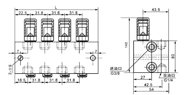若需相應(yīng)上下出口合并時,只需將上出油孔內(nèi)的壓緊螺塞用6mm內(nèi)六角扳手?jǐn)Q出,取出分油套通孔向下裝入,再擰緊壓緊螺塞,此時上出口用G1/4螺塞封堵以防灰塵侵入。