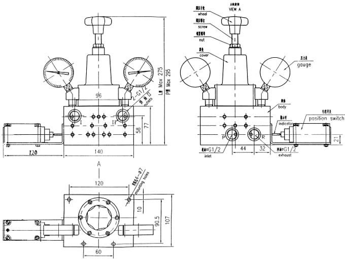 一、概 述 ZYP型液壓自動換向閥是我廠吸收國外先進技術(shù)、在同類產(chǎn)品DR4-5基礎(chǔ)上自行研制開發(fā)的新一代產(chǎn)品,它廣泛適用于冶金、化工、電力、水泥機械、建材機械、港口機械雙線干油集中潤滑系統(tǒng)中,尤其適用于冶金行業(yè)快速離檢干油潤滑系統(tǒng)、水泥機械環(huán)式潤滑系統(tǒng)中。具有結(jié)構(gòu)緊湊、體積小、重量輕、外型美觀、操作方便、換向穩(wěn)定、壓力波動值小、使用壓力等級高、性能可靠、壓力直觀、換向壓力可調(diào)等優(yōu)點,代替了國內(nèi)20Mpa、40Mpa液壓換向閥、二位四通電磁閥、三位四通電磁閥,以及末端必需配備的壓力操縱閥、壓差開關(guān)、電氣管線配置等元件,組成干油潤滑系統(tǒng),從而減少了系統(tǒng)故障、降低了投資成本。本閥可配置行程開關(guān)或接近開關(guān),從而實現(xiàn)整個系統(tǒng)的控制。 二、功能和結(jié)構(gòu)說明 本閥為二位四通自動液壓換向閥,上平面設(shè)有兩塊壓力表和調(diào)壓手輪。換向壓力由手輪調(diào)節(jié),順時針壓力升高,反之壓力降低。本閥門進油口P與泵出油口連接,回油口R接貯油桶,供油口Ⅰ、Ⅱ分別與兩條供油管路連接。工作時當Ⅰ路油壓達設(shè)定壓力,換向閥自動切換到Ⅱ路,這樣潤滑泵就能循環(huán)往復(fù)地向兩條管路供送潤滑脂。