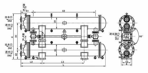 二、特點(diǎn) 1、表列數(shù)據(jù)為二流程列管式雙聯(lián)油冷卻器,若需要可選用四流程、六流程、裸管或翅片冷卻管的冷卻器。 2、冷卻器安裝通常為臥式,如用戶(hù)需要時(shí)可采用二種立式布置,一種進(jìn)水室在下、另一種進(jìn)水室在上,便于管束拆卸。 3、油水接口法蘭標(biāo)準(zhǔn)按JB/T81-94,根據(jù)用戶(hù)要求配非標(biāo)法蘭時(shí)應(yīng)滿(mǎn)足配管要求。 4、根據(jù)AP Ⅰ 614 標(biāo)準(zhǔn),冷卻器采用雙聯(lián)結(jié)構(gòu),由二只相同面積的冷卻器和三通閥裝置構(gòu)成,一只工作,一只備用,每個(gè)冷卻器能承受整個(gè)系統(tǒng)的冷卻負(fù)荷,管板一頭固定,一頭浮動(dòng),可拆卸的管束和水室箱蓋,便于運(yùn)行過(guò)程中清洗、檢查和維修。冷卻器的材質(zhì),根據(jù)使用場(chǎng)所、水系統(tǒng)條件可有多種選擇,水室、殼體、三通閥可選碳鋼或全不銹鋼,管板可用碳鋼、不銹鋼或黃銅板;管子材料可選普通黃銅管H68、砷黃銅管HSn70-1A,鋁黃銅管HA177-2A,不銹鋼管1Cr18Ni9Ti、B10、B30 等。 5、三通閥采用鋼制焊接結(jié)構(gòu)連續(xù)流轉(zhuǎn)換閥。這種閥門(mén)在內(nèi)部結(jié)構(gòu)發(fā)生故障或閥門(mén)轉(zhuǎn)換期間不會(huì)造成油路的中斷。外形如圖示。